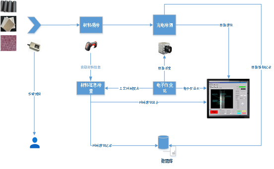 作業(yè)指導書為核心實現(xiàn)全作業(yè)流程的在線指導和提示,必要環(huán)節(jié)通過工業(yè)相機進行視覺采集分析,實現(xiàn)材料的材質、纖維方向、位置和尺寸形狀的檢測,通過電子顯示屏提醒人工作業(yè)是否符合作業(yè)指導書要求,保證結構件的生產符合生產工藝要求,并通過數(shù)據(jù)庫系統(tǒng)記錄加工生產中的批次、人員、檢測以及記錄圖像等信息,全流程可控,便于加工工藝優(yōu)化改進,提高生產效率。